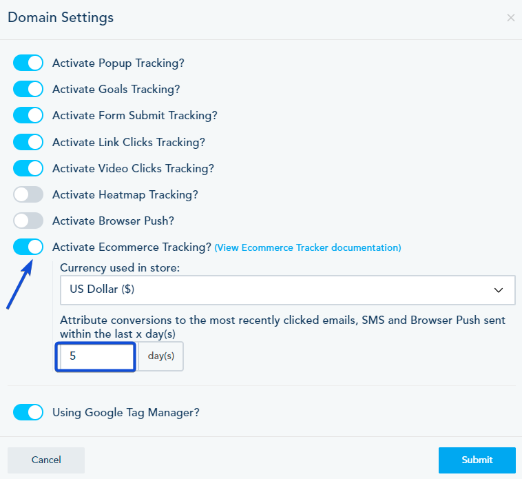 In the Domain Settings, Turn on the Active Ecommerce Tracking and specify the number of days to attribute the conversion.