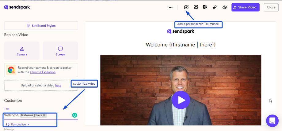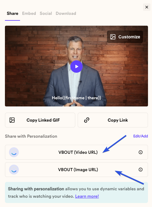 These merge tags will automatically update for each recipient. If the recipient’s information is unknown, they will see a fallback. You can either customize the video with a personalized title/message or you can add a personalized thumbnail.