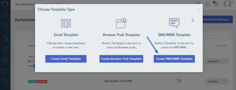Go to Automation -> Automated Messages -> Create Automated Message, choose to Create SMS/MMS Template.