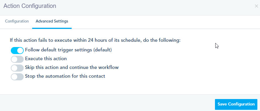 In the advanced settings, you will have the option to decide what to do in case an action fails to execute within 24 hours of its schedule.