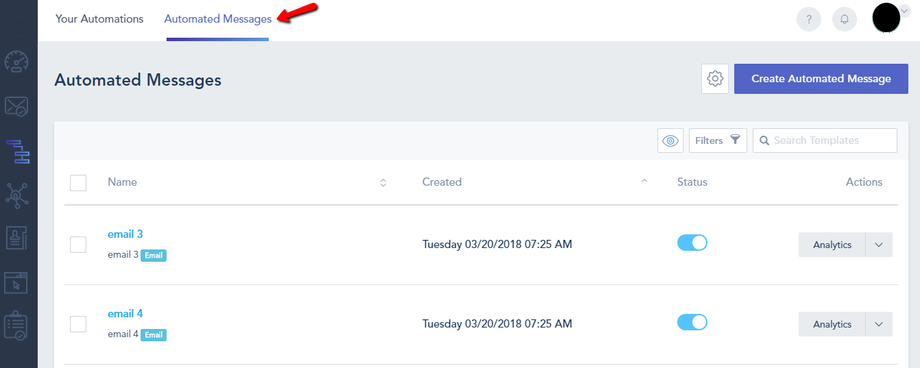 When creating automation with email sequences, you will need to have your email automated messages ready so that you can set them up inside your automated workflows. To get started with managing and creating your automated messages, go to Automation from the left sidebar and click on Automated Messages from the top menu.