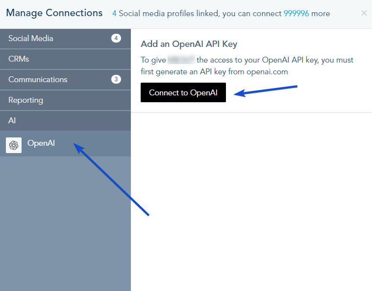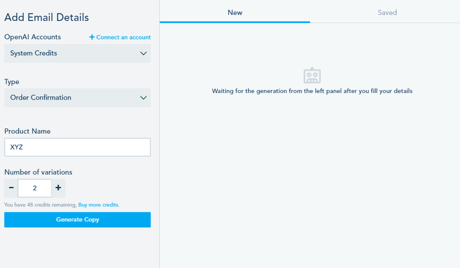 - Install the Copy AI Assistant add-on from the Add-ons section or connect your own OpenAI account (free of charge) by navigating to the Connection Center and clicking on “Connect to OpenAI.”