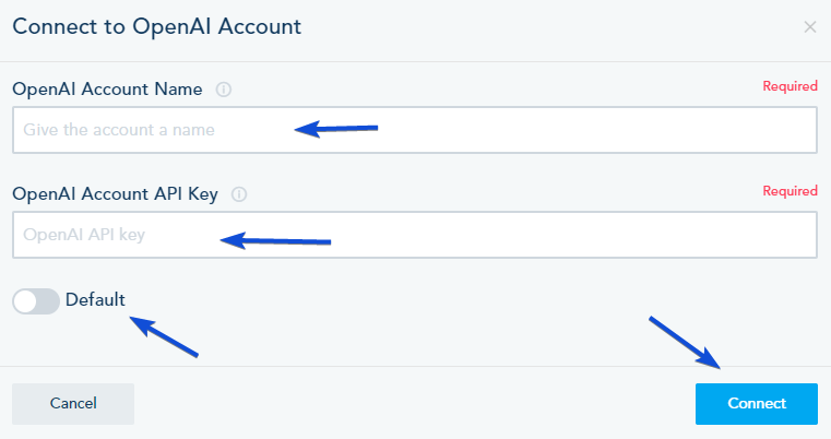 - Provide a name for your OpenAI account and enter your API key.