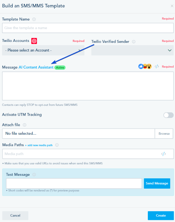 - You can find the AI Content Assistant while creating your SMS/MMS template.