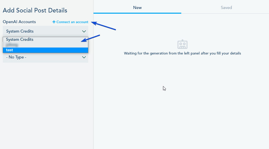 - Choose whether to use the AI Content Assistant add-on credits (System Credits) or connect your own OpenAI account for content generation.