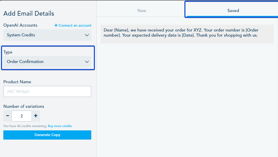 Note: Please be aware that with the AI Content Assistant add-on, you have 50 credits initially, and each generated variation will consume one credit. Additional credits can be purchased from the Add-ons section if needed.