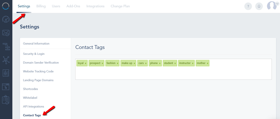 Managing Tags: To add/remove tags from your account visit your Settings page, Contact Tags.