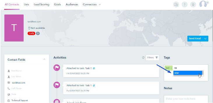 Adding Tags to Contacts: Visit your Contact’s page, click on a record, and add tags to this contact from the right panel.