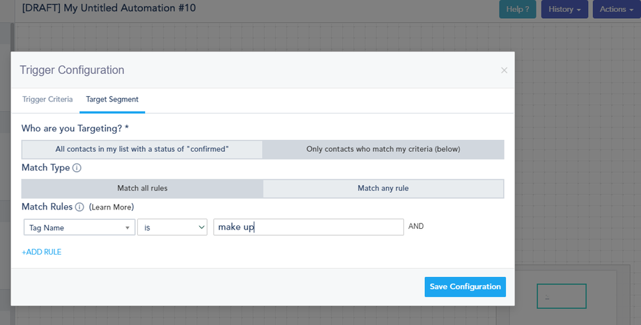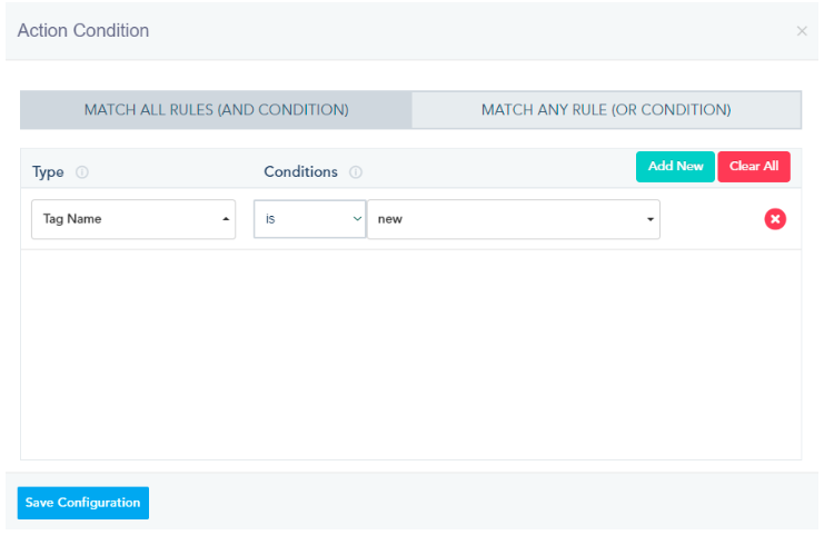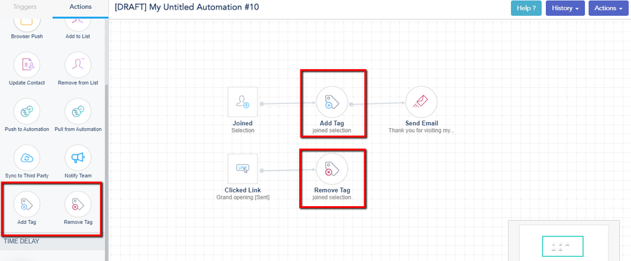 Tags in Automation: You can use the actions Add Tag or Remove Tag in the automation by using the visual workflow builder. Similarly to the contact page, you can add tags on the fly even if they don’t exist on your Settings page.