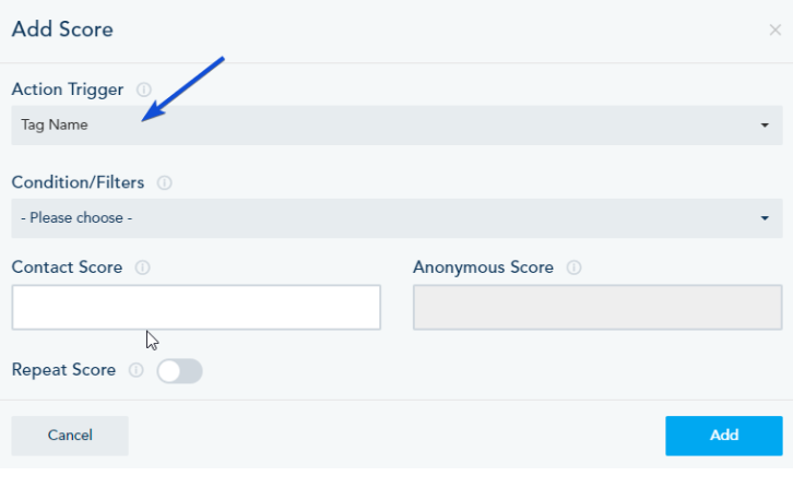 Tags and Lead Scoring: you can use tags inside the lead scoring rules, by choosing the Action Trigger “By Tag Name”: