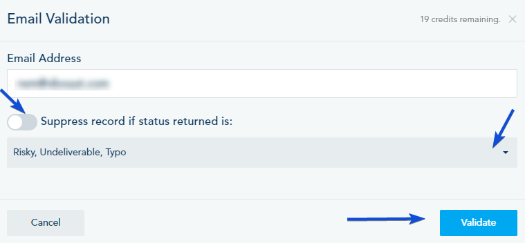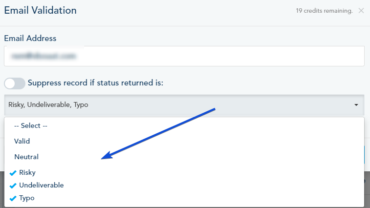 Also, you can choose Email Validation from drop-down menu inside the Lead profile.