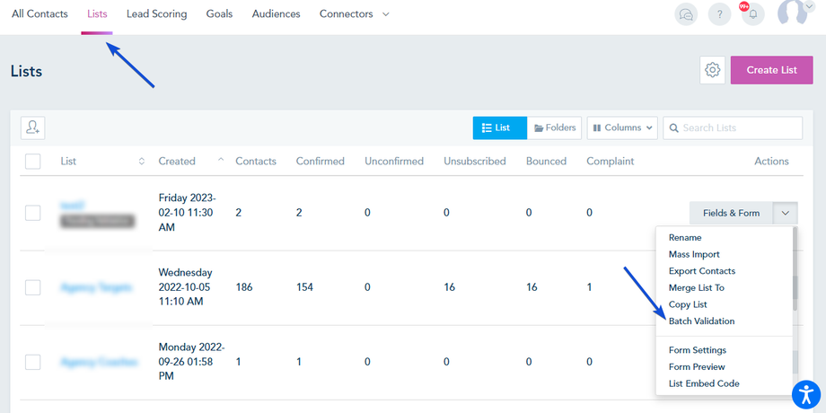 Go to Lists, choose Batch Validation from the drop-down menu next to the list.