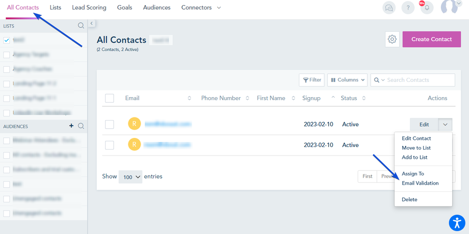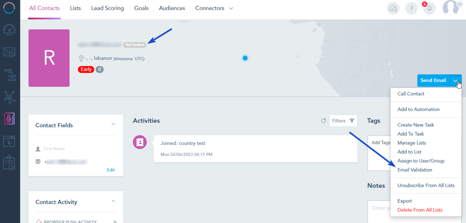 From the All Contacts page, choose Email Validation from the drop-down menu of the contact.