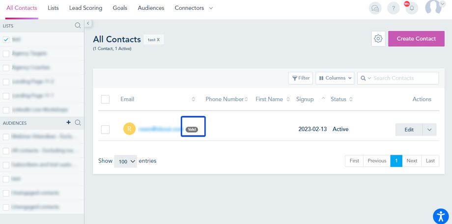 Once the validation process is completed, you can see the email status on the All Contacts page and inside the Lead profile.