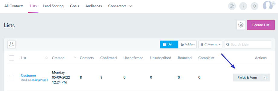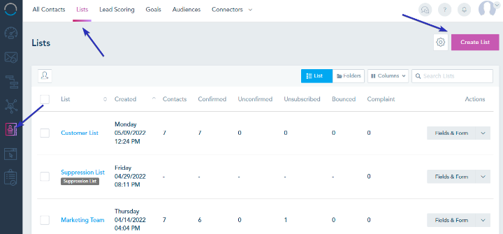 Click on the Contacts option from the left sidebar, select the Lists tab from the top, and click on the Create List button: