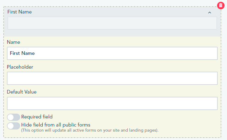 If you want to remove a field, rename it, change its placeholder, default value, make it required or not or hide it from all public forms, click on the arrow next to it and you will be able to change it: