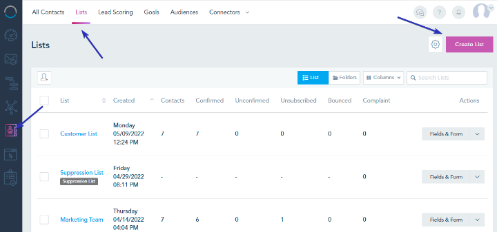 To get started, you need to first create a list, click on the Contacts option from the left sidebar, select the Lists tab from the top, and click on the Create List button: