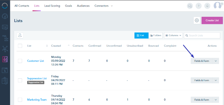 After you create your list, you can build up the multi-step form with the needed fields. From your lists view, find the list you wish to configure and click on Fields & Form.