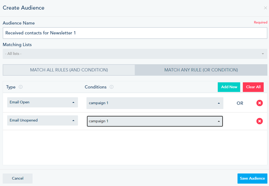 The audience will be created with the below conditions. Please note that you can specify a specific email campaign or All campaigns.