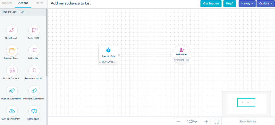 To create the automation, choose the Specific Date trigger and link it to Add to list Action.