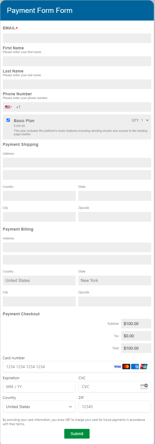 Payment Billing: When adding this field, the user will have the opportunity to provide their billing address, including country, state, city and Zip Code..