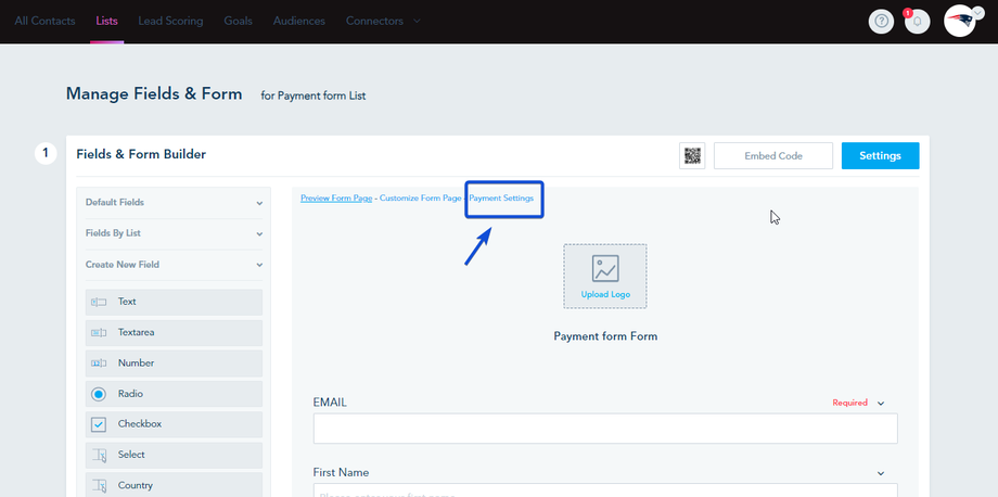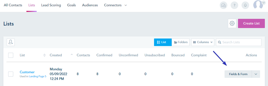 After creating a new list, navigate to the “Fields & Form” option located next to your designated list.