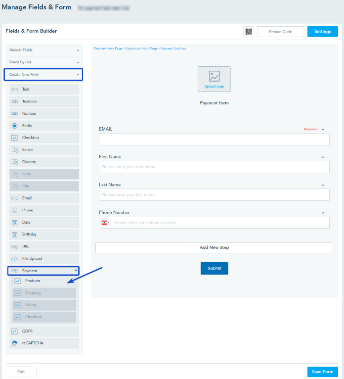 In the Form builder, go to the “Create New Field” section, then select “Payment.” Click on “Products” to add the Payment Product field.