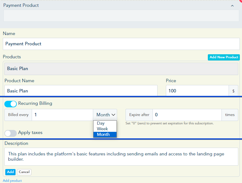 - For subscription-based products, you can opt for ‘Recurring Billing.’ This allows you to specify billing intervals (monthly, weekly, or daily) and set a limit on billing cycles.