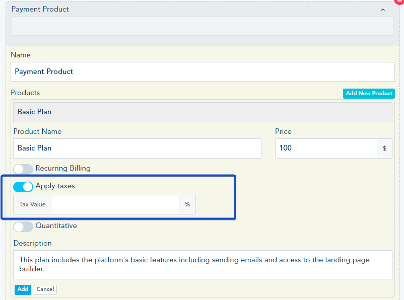 - If necessary, activate ‘Apply Taxes’ and specify the tax percentage for automatic tax calculations.