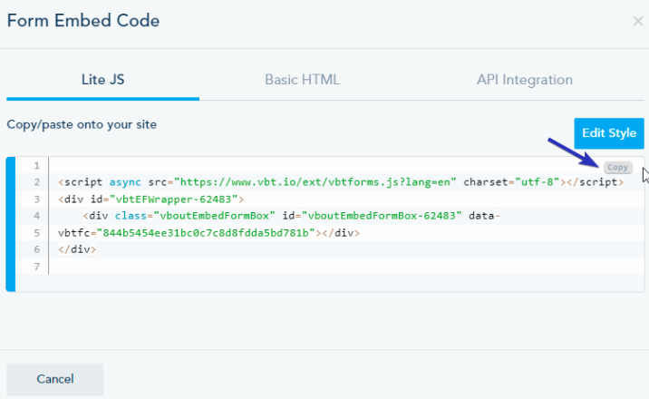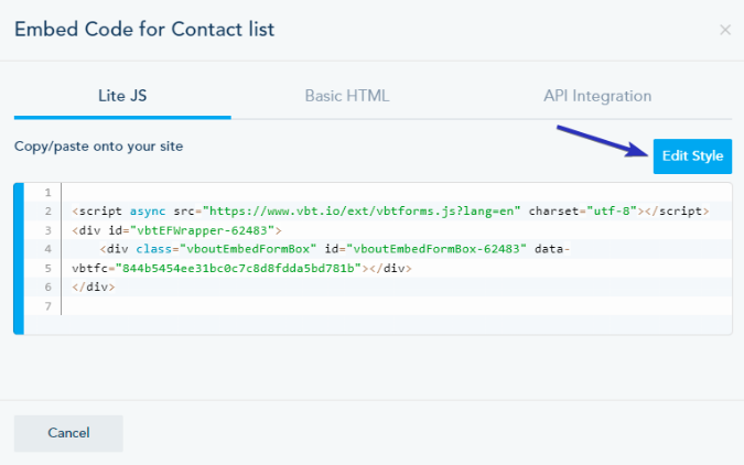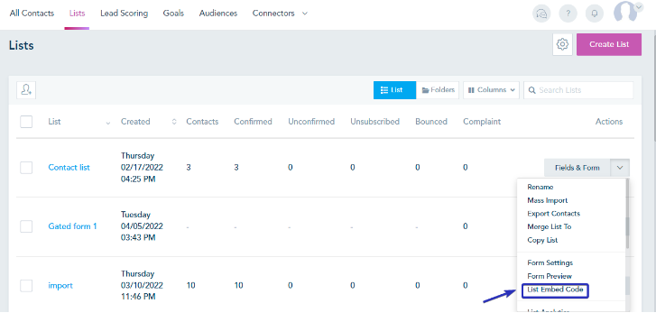 To access the Lite JS code, click on List Embed Code: