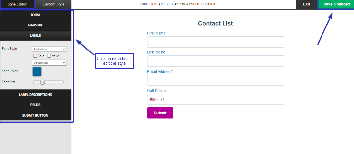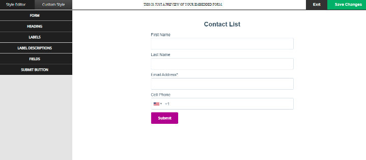 You have the option to edit the form style, Heading, Labels, Label descriptions, Fields, and Submit button.