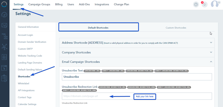 - Copy the link of the landing page or external page you wish to redirect your contacts to after they unsubscribe and paste this link into the “Unsubscribe Redirection Link” option.