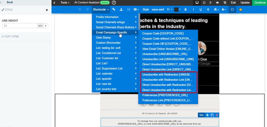 - Under the Default Shortcodes section, open the Email Campaign Shortcodes subsection.