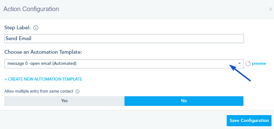 In the Action configuration, you can choose the email you want to send from the Automated Messages created.