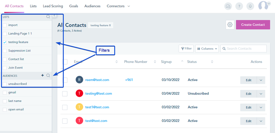 You can manage all your Contacts, Lists and Audiences from one page by going to Contacts –> All Contacts. On this screen you can view and search all your contacts and filter them by List or Audience name from the left panel.
