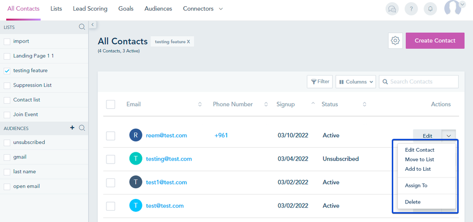 Each contact can be edited, moved to another list, added to another list (copy), assigned to Group or User, or deleted from your account. You can also add a new record by clicking on Create Contact.