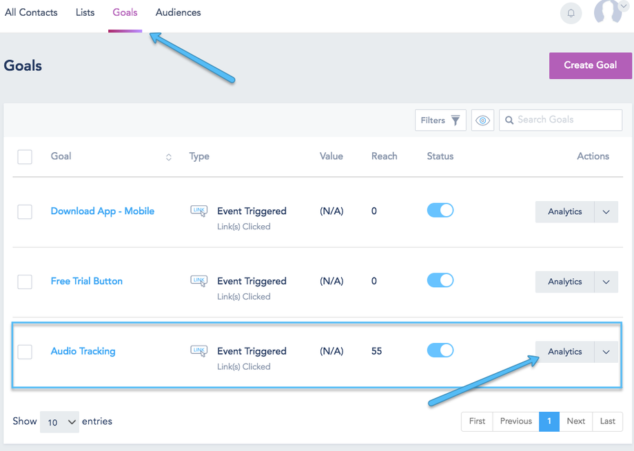 - The page will display a table summary of your goals type and performance summary. Find your desired goal and click on the Analytics option next to that goals.