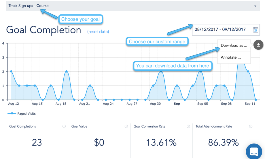 - The top preview of the report include a drop down to easily switch between goals and a line-chart of the daily conversion of that goal. You can change the default time period of that report by clicking on the date-picker.