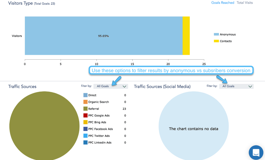 - The bar chart displays the percentages for the types of users who reached that goal. It is broken down by Anonymous (random visitors without contact information) and Contacts (Active contacts that are cookied and can be found under your Contacts lists).