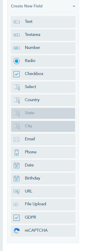 The platform has 17 different form elements that you can add to your custom forms. These fields will determine the final fields used on the list: