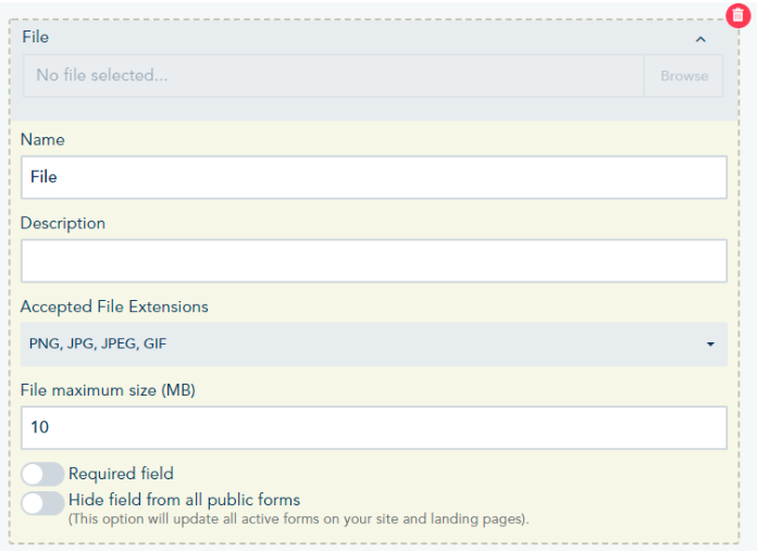 15. File Upload: This field is used to allow contacts to upload files while filling the forms (ex: upload an image, a pdf cv…)