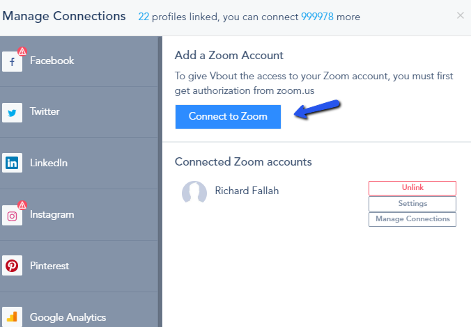 Connect your Zoom account and make sure to approve the authentication screen through Zoom.