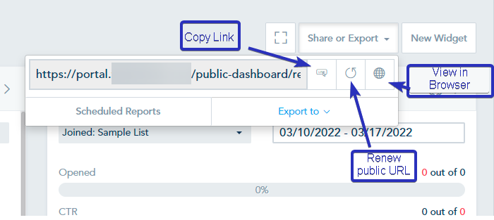 - Viewing your dashboard via a public URL which you can share with colleagues or clients. The URL has a private token that can be renewed to revoke access for the old URL. To preview the publicly accessible version of the report you can click on the View in Browser icon.