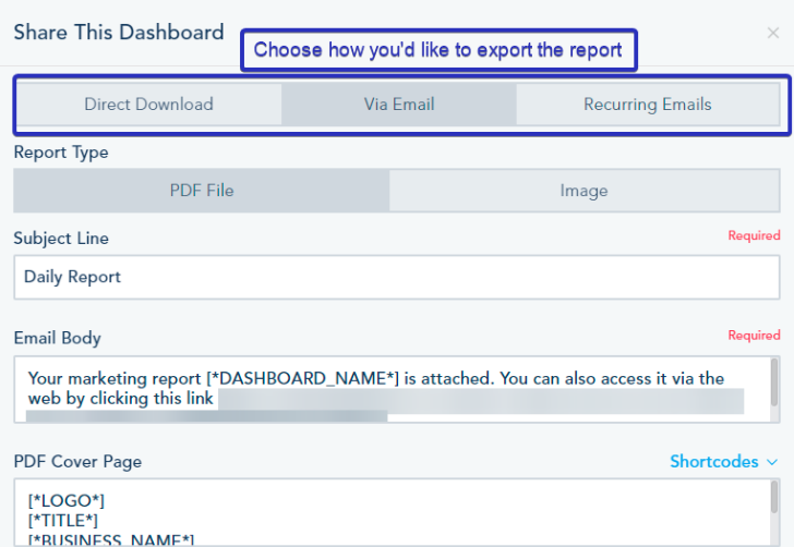 - Sharing the current Dashboard in PDF format or PNG format. To do this, you can click on the Export to dropdown which will present you with 3 actions to choose from. You can choose Direct Download which might take up to few minutes to reproduce the export file, Via Email which typically sends the report as attachment in the email, or Recurring Emails which allows you to schedule the sending of the report in a Daily, Weekly or Monthly manner.