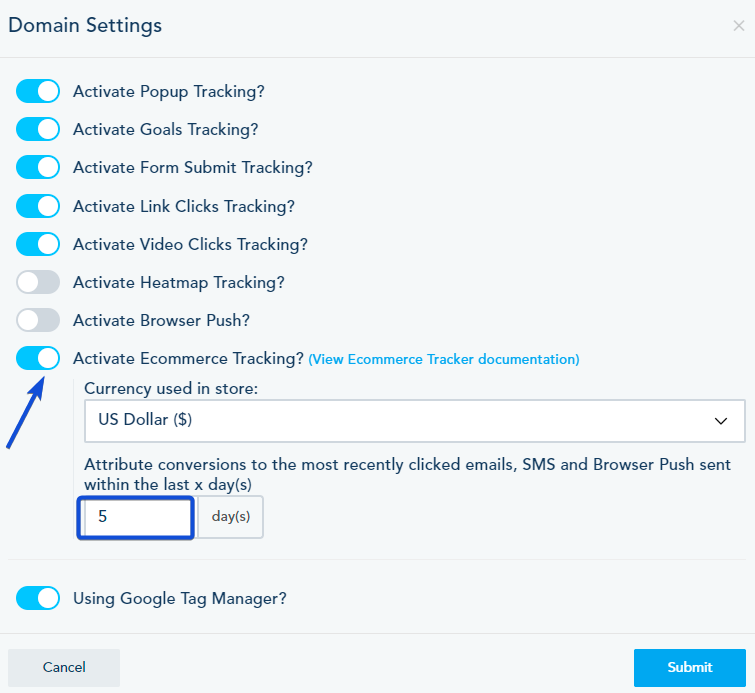 In the Domain Settings, Turn on the Active Ecommerce Tracking and specify the number of days to attribute the conversion.