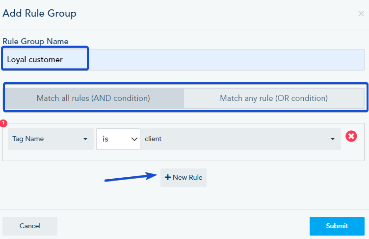 Give it a name and add a new Rule. You can add multiple rules and you have the option to select: Match all rules (AND condition) or Match any rule (OR condition).