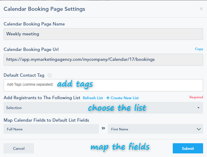 You can add tags for the contacts, choose a list and map the fields from the calendar to the list: