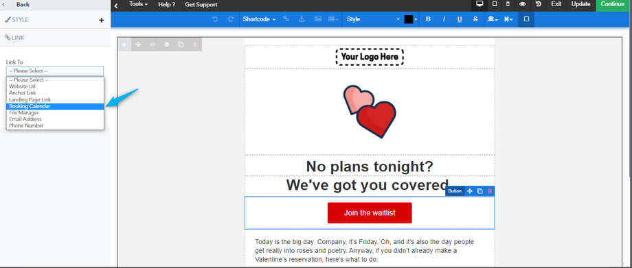 Note that you can add the link of the Booking Calendar to your Email or Landing Page by using the Link To option: