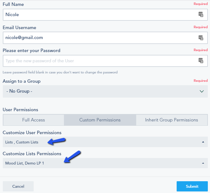 If you want your users to have access to specific list, you can give Custom Lists access. Go to Users and edit a user: Choose Custom Lists in the Custom permissions, choose the lists and save: