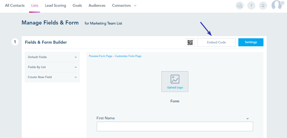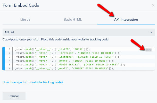 - Get the API code of that list. To get API code click the Embed Code Button